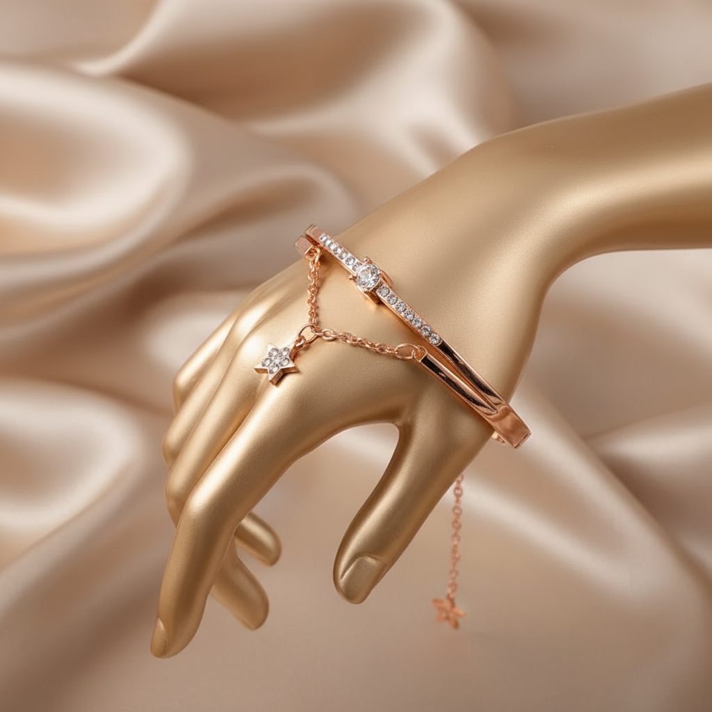 This captivating bangle combines celestial charm with modern elegance. The warm rose gold finish and sparkling crystals create a romantic aesthetic, while the dangling star adds a playful touch of magic. Perfect for dreamers and star-gazers who want to carry a piece of the night sky with them.